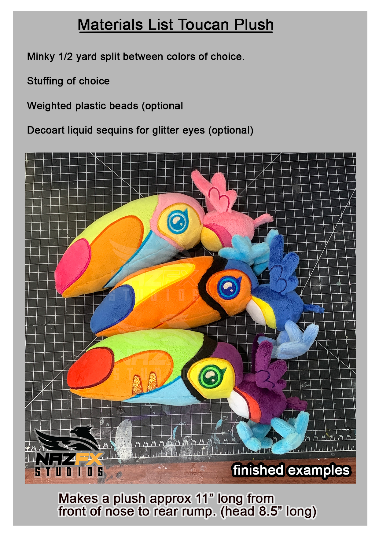 Pattern makes a plush approx 11" long from front of beak to back of rump.