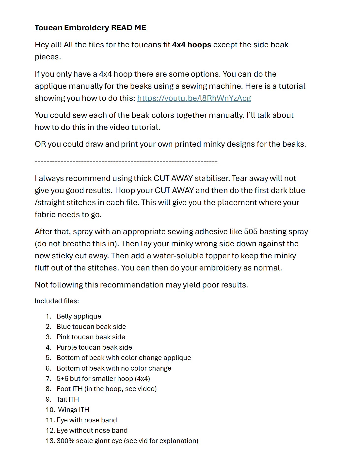 If you only have a 4x4 hoop there are some options. You can do the applique manually for the beaks using a sewing machine. Or you could sew each of the beak colors together manually. I’ll talk about how to do this in the video tutorial. OR you could draw and print your own printed minky designs for the beaks